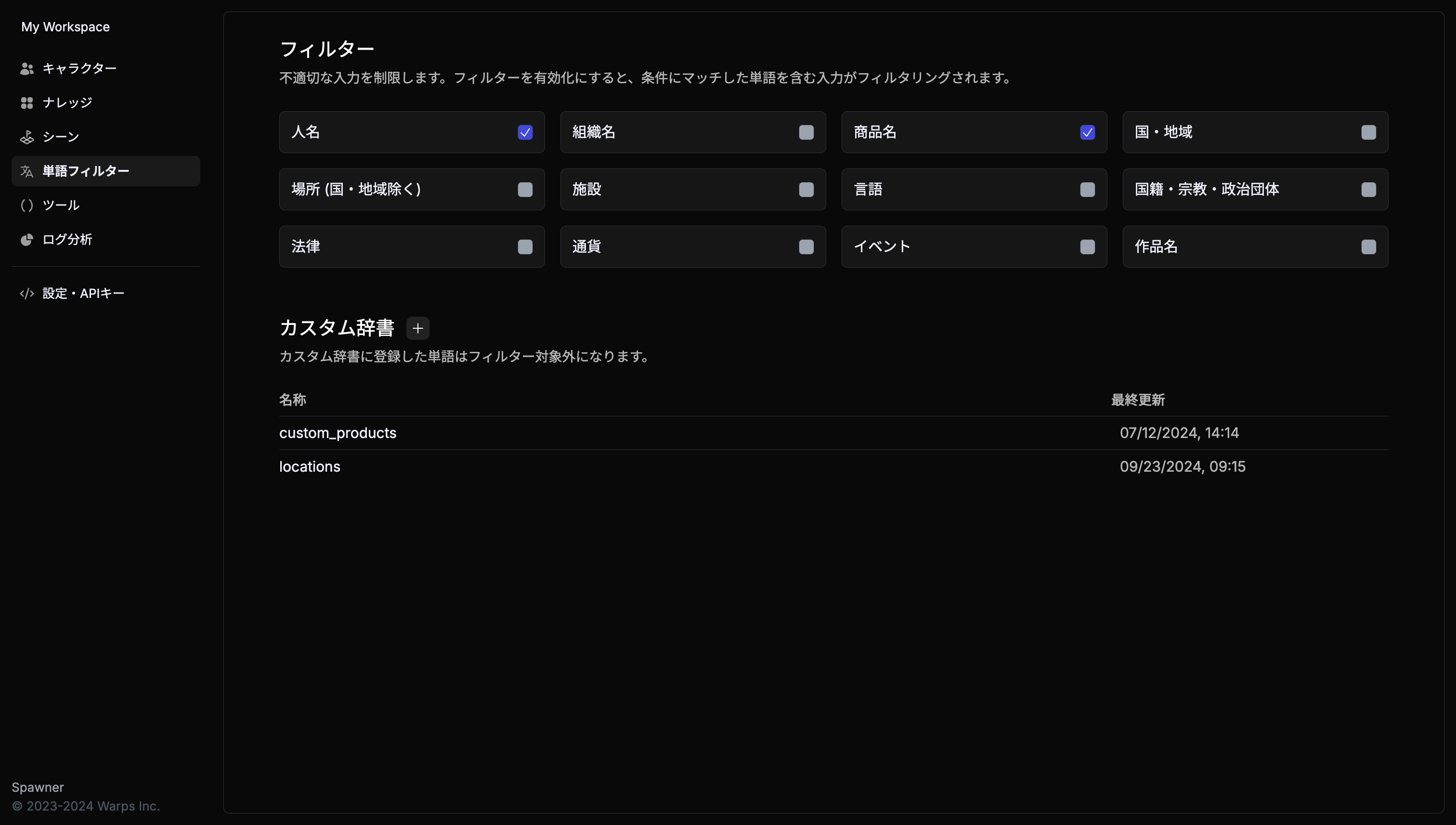 辞書に登録された単語はフィルターから除外されます。例えば、作中に登場するキャラクター以外の人名をブロックする場合は、辞書にキャラクター名を登録することで「登録されたキャラクター名以外」をブロックします。