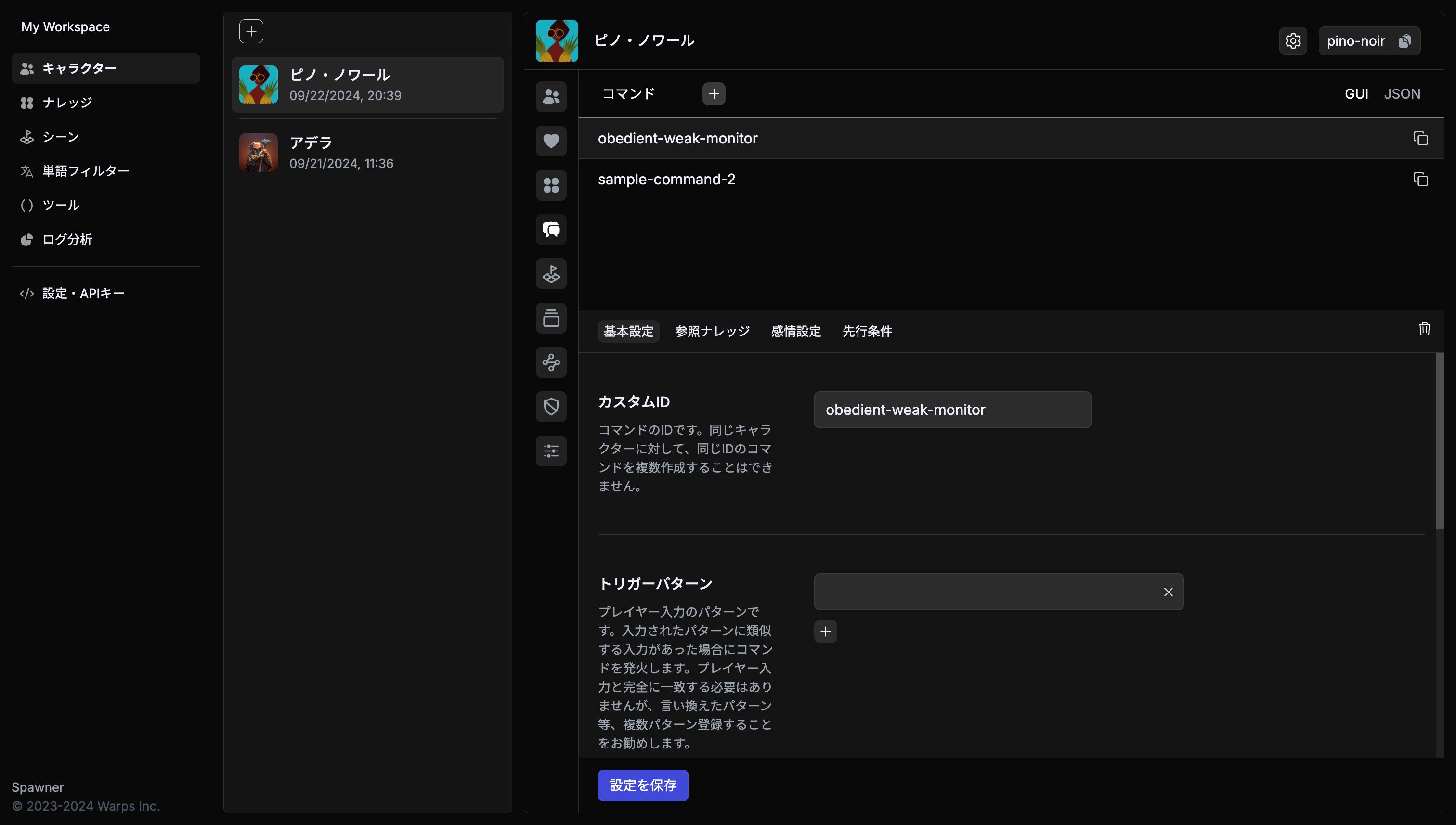 コマンド発火時、キャラクターがどのような返答をするべきか指示することができます。